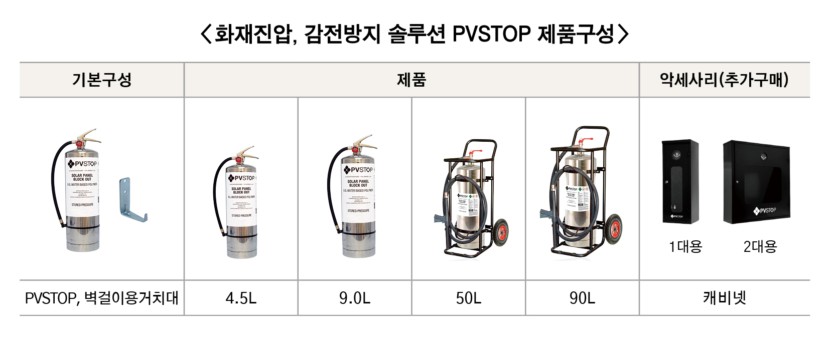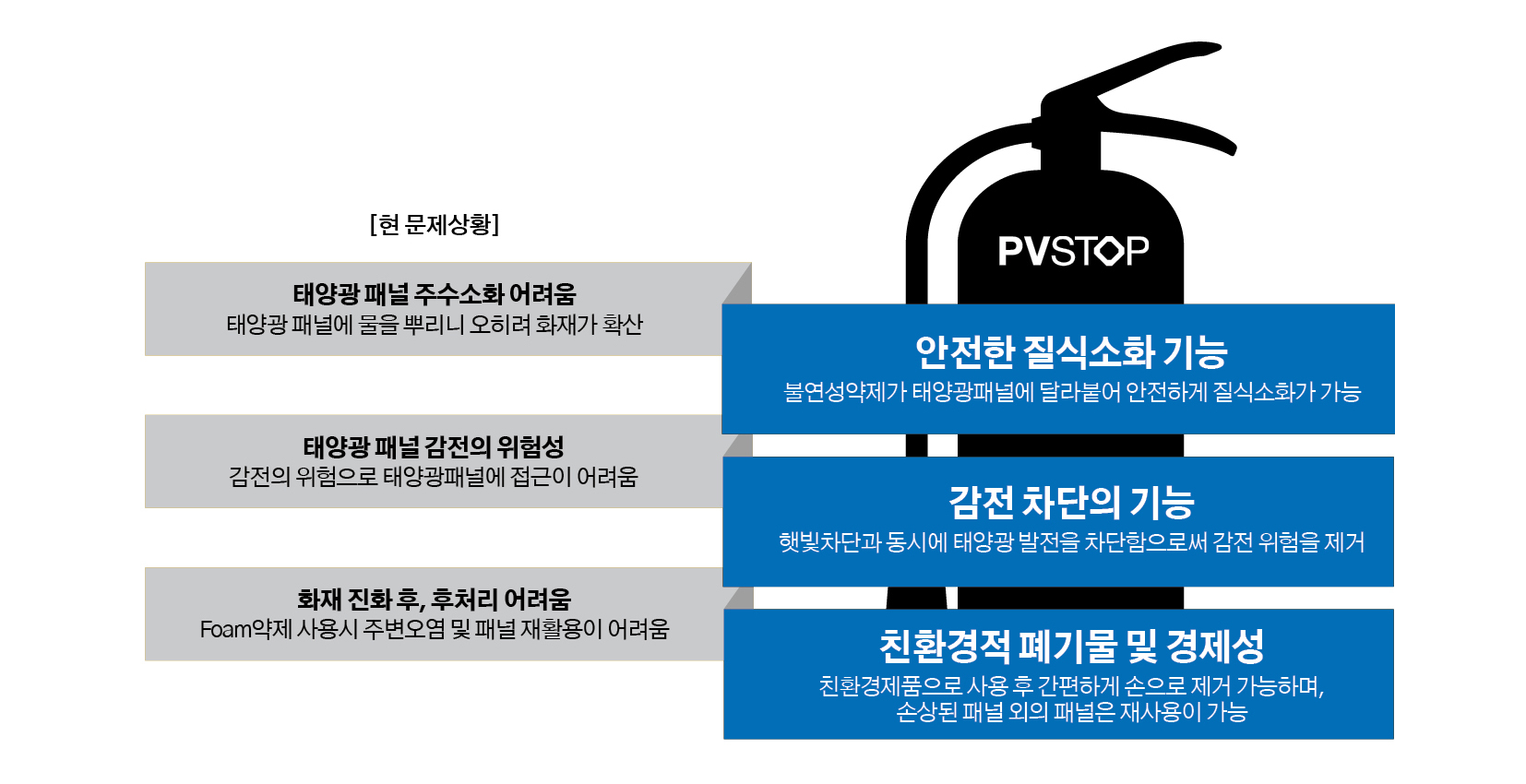 ---------- ■ 현 소화 방법 패널 화재 시, 주수소화를 하면 감전 사고의 위험성이 있으므로 주의하여야 합니다! 또한 Foam 소화약제를 사용하게 되면 후처리가 매우 어렵다는 단점이 있습니다. ---------- ■ PVSTOP 적용 시 - PVSTOP은 일반 소화기와 같은 사용법으로, 약제 분사거리는 10M 입니다. - 특수약제가 태양광패널을 덮는 방식으로 안전한 질식소화가 가능합니다! - 단 몇초만에 태양광패널을 햇빛으로부터 차단하여 감전의 위험을 제거할 수 있습니다. - 또한 고무형태로 굳는 PVSTOP약제는 친환경 제품으로 손쉽게 제거가 가능합니다!