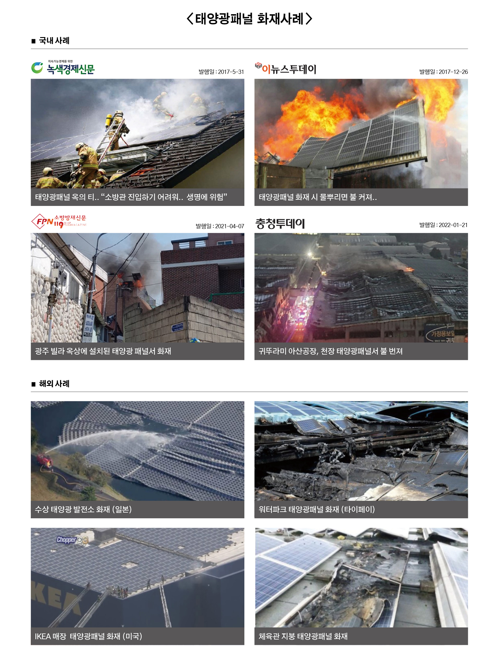 위 화재사례 사진들처럼 PVSTOP은 태양광 패널에 화재 발생 시에 사용됩니다. 태양광 패널에서 화재 발생 시 외에도 PVSTOP은 태양광 패널이 파손 됐을 시, 태양광 패널이 있는 건축물에 화재가 발생했을 시, 감전의 위험이 예상 될 시에도 사용되기도 합니다.