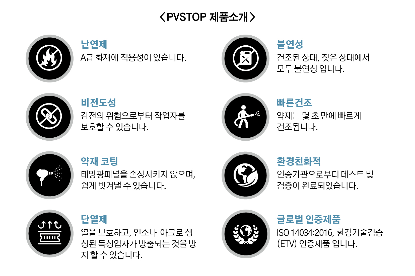 PVSTOP은 태양광패널로부터 햇빛을 차단하여 화재진압, 감전방지를 하는 태양광패널 전용 소화기 입니다!