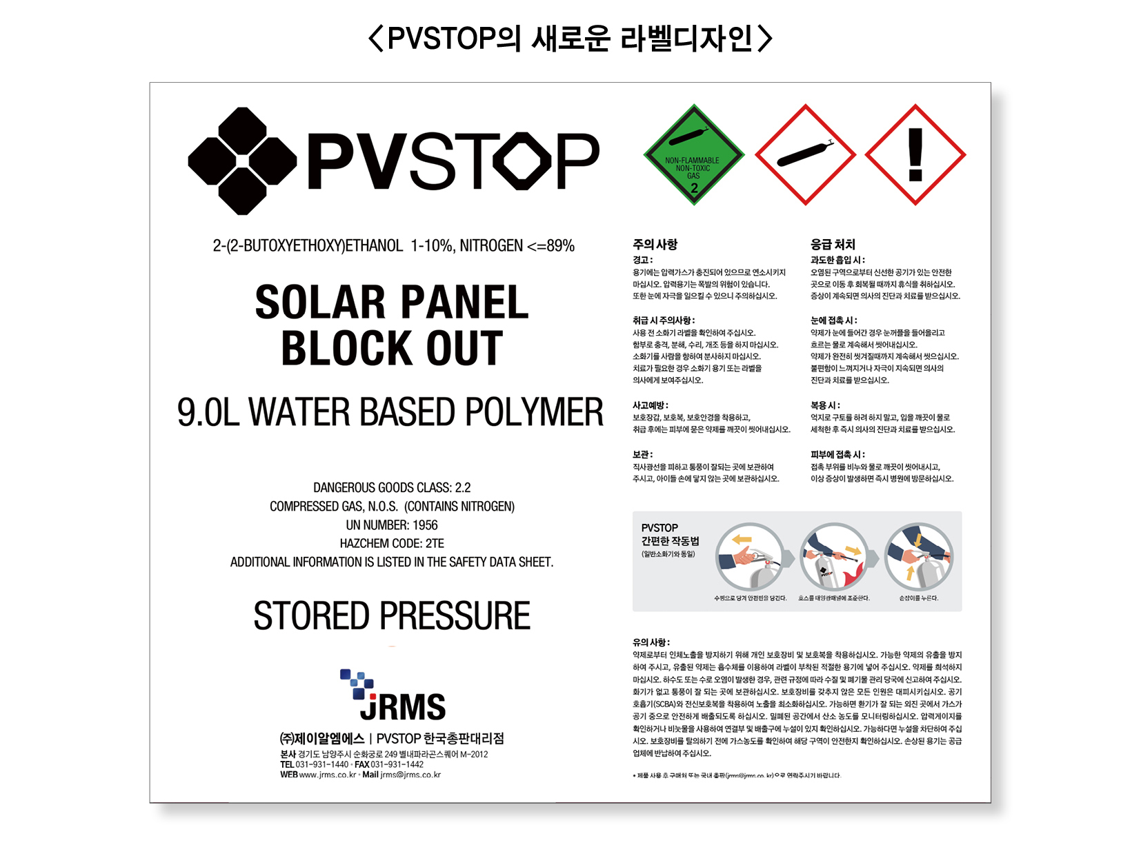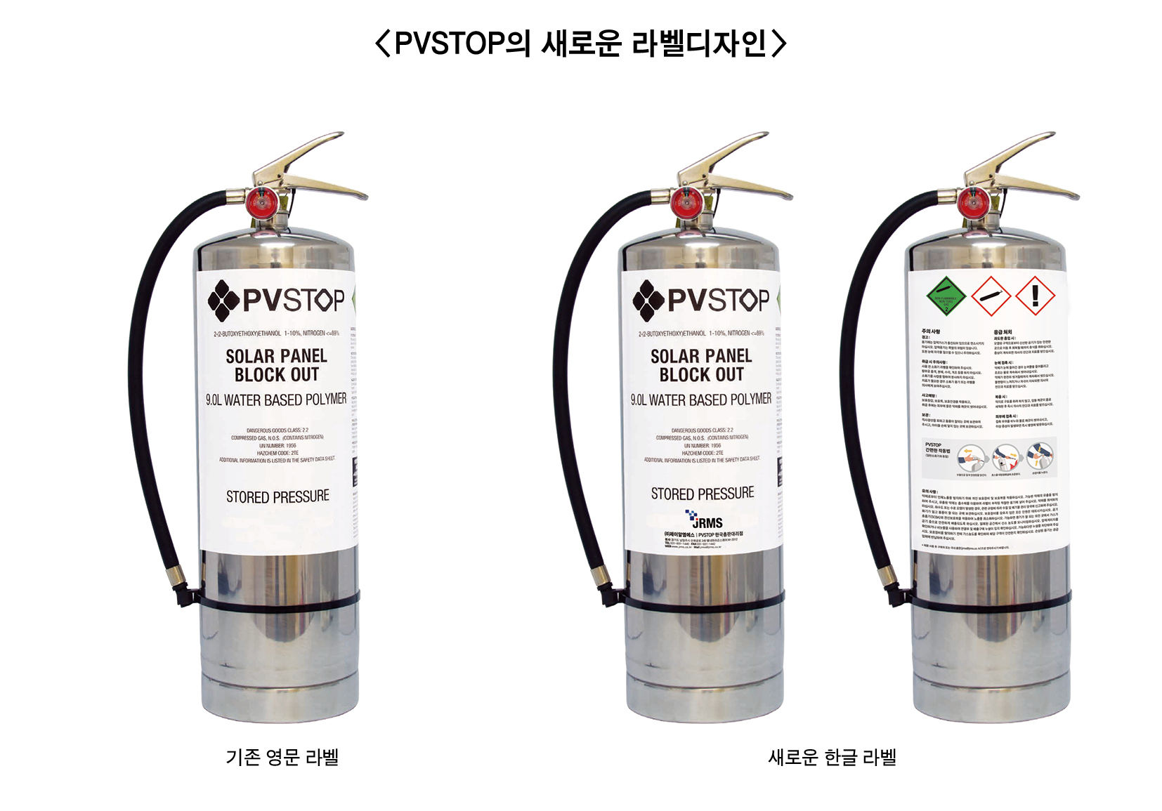 새로운 디자인으로 깔끔하게 단장한 PVSTOP. 태양광패널 소화기 PVSTOP에 관한 문의는 국내총판대리점 JRMS로 언제든지 연락바랍니다. |