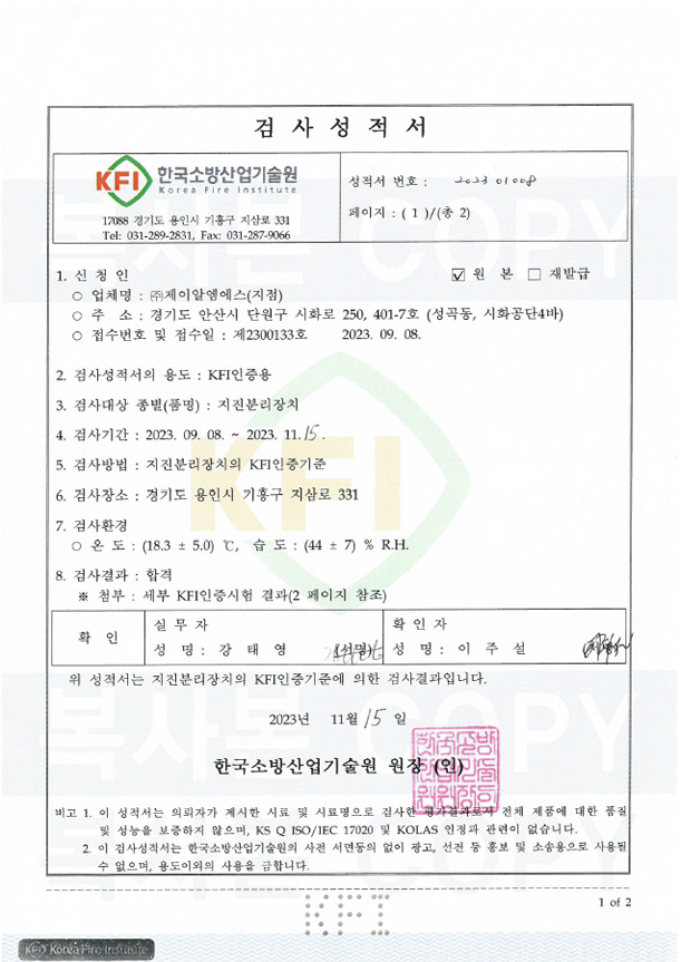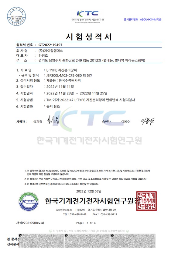- It has been certified with a maximum pressure of 20K for displacements of ±25mm to ±610mm (the highest pressure and displacement in Korea).